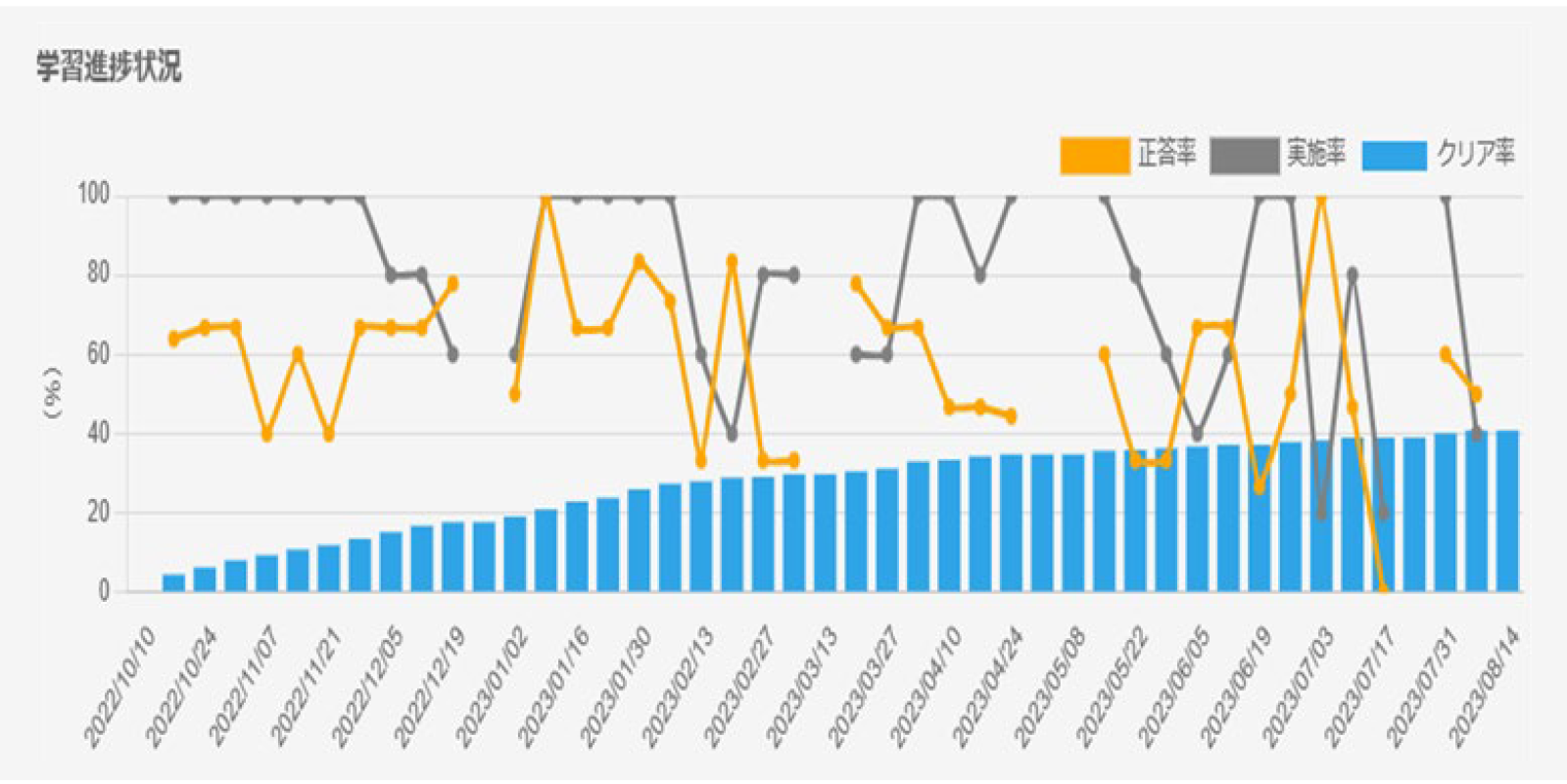 クリアした問題が、個人ごとに管理され、全問題に対するクリア率がグラフで「可視化」、学習の成果が数値で確認できます。また、現場や組織全体のクリア率の平均値も「可視化」されるので、現場や組織全体の学習成果を確認することが出来ます。
