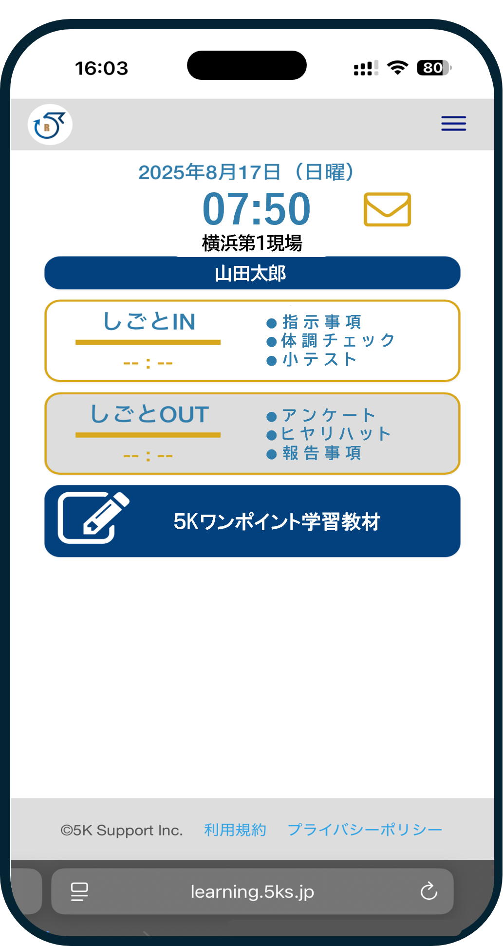 はい。出勤時には健康状態の入力、退勤時にはヒヤリハットの入力などが可能です。管理者はこれらのデータをクラウドで確認できますので、働く人の体調管理や安全管理の向上につながります。